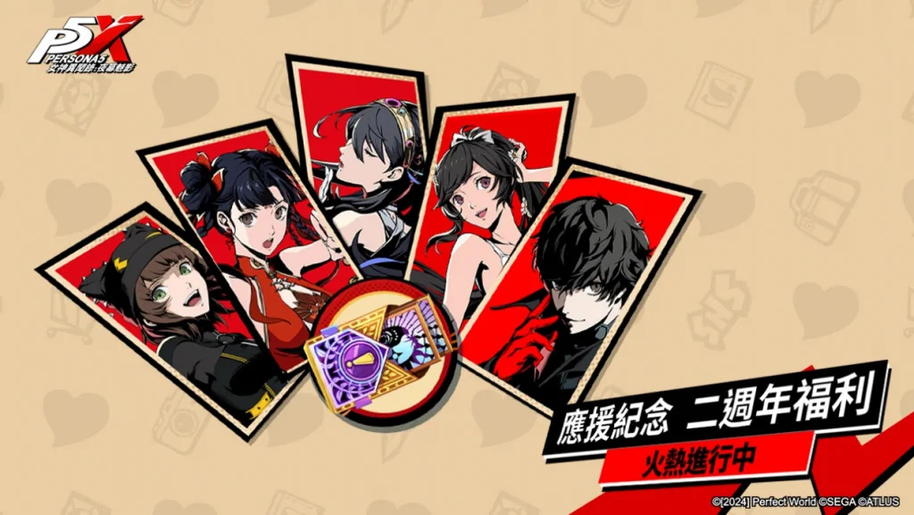 P5X迎來上市二週年,為感謝玩家一路以來的支持與陪伴,營運團隊準備多重福利及週年限定活動回饋玩家,邀玩家共慶二週年盛典。活動期間,玩家登入遊戲即可獲得長尾愛歌、結城理、李瑤鈴‧太平樂等自選限定角色一位;橋本麻由美、道玄坂琉七、雨宮蓮等自選常駐角色一位。